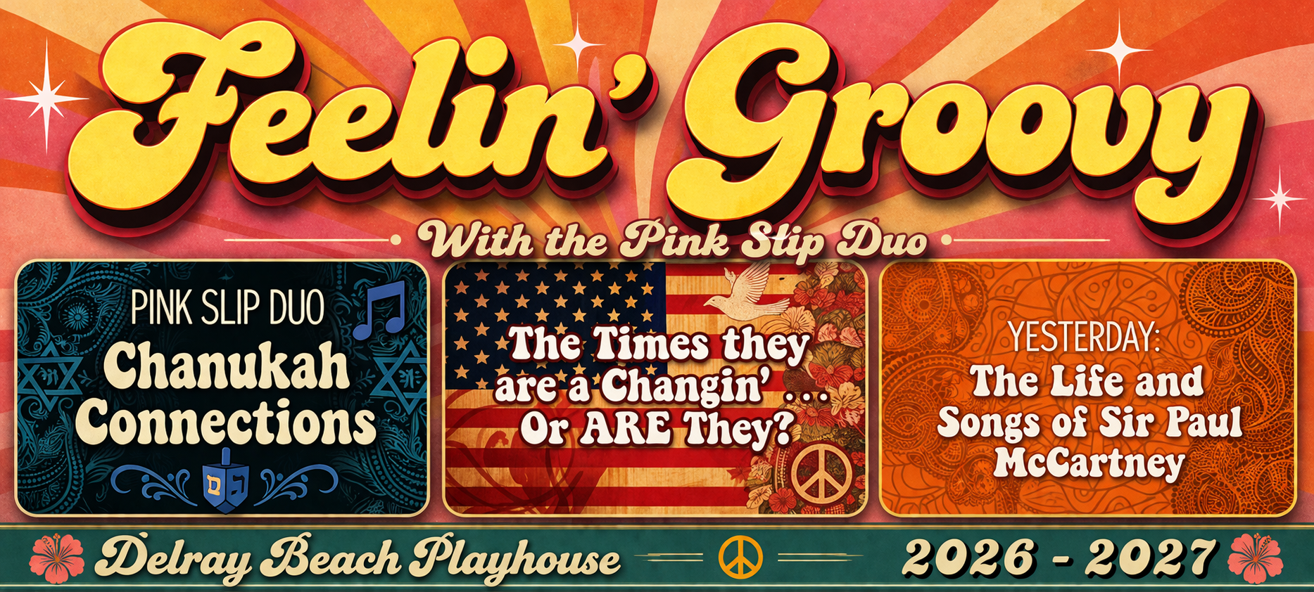 Our 2026-2027 FEELIN’ GROOVY SERIES includes: Chanukah Connections (December 8th and 9th, 2026), The Times they are a Changin’ or ARE they? (February 17th and 18th, 2027), Yesterday: The Life and Songs of Sir Paul McCartney (April 13th and 14th, 2027). All showtimes are at 2:00pm!